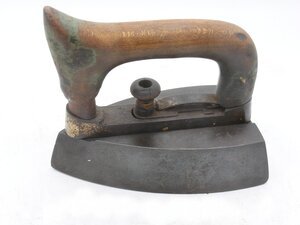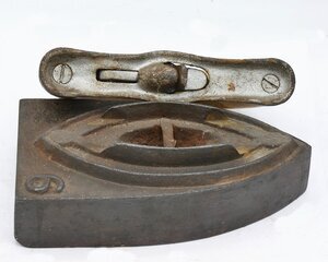 Bügeleisen (Satzeisen) mit halbrundem Holzgriff: Das Bügeleisen besitzt einen ausklinkbaren Holzgriff und wird wegen des Auswechselmechanismus als Satzeisen bezeichnet. Konkret wird durch den Zug am Knopf unter dem Holzgriff ein darunter befindlicher Haken gelöst, der einen Stift im Eisen umfasst und so den Bügel mit dem Eisen verbindet. Mittels eines Druckknopfes lässt sich der Griff lösen. So war es möglich mit mehreren Eisen zu arbeiten. Gussmarke: 6 - keine weiteren Informationen zum Hersteller Satzeisen gehen auf ein amerikanisches Patent aus dem Jahre 1871 zurück. Sie besitzen eine mit Asbest isolierte Bügeleisendecke und einen ausklinkbaren Holzgriff den man auf auf eines der meist 4 Eisen klemmen konnte. Im Laufe der Zeit entwickelten die Hersteller viele verschiedene Klemmmechanismen. Vor dem Bügeln wurde das Eisen auf einem Herd erhitzt und anschließend der Holzgriff aufgesetzt, um die Wäsche zu glätten. Beim Bügeln werden mehrere Eisen gleichzeitig auf einem Ofen aufgeheizt. Ein Eisen wird an den Griff geklemmt und mit diesem wird gebügelt. Wird das Eisen im Laufe der Zeit zu kalt, so wird der Griff abgeklemmt und an ein anderes, heißes angeklemmt. Sofort kann dann mit diesem gebügelt werden und das erkaltete Unterteil wird auf den Herd gestellt. Satzeisen setzten sich schnell durch, da sie im Vergleich zu Bolzeneisen viel einfacher und sicherer zu bedienen waren. Auch nach der Elektrifizierung waren sie auch aus Sparsamkeitsgründen noch lange in Gebrauch.