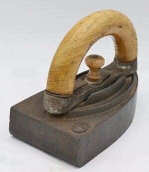 Bügeleisen (Satzeisen) mit halbrundem Holzgriff: Das Bügeleisen besitzt einen ausklinkbaren Holzgriff und wird wegen des Auswechselmechanismus als Satzeisen bezeichnet. Konkret wird durch den Zug am Knopf unter dem Holzgriff ein darunter befindlicher Haken gelöst, der einen Stift im Eisen umfasst und so den Bügel mit dem Eisen verbindet. Mittels eines Druckknopfes lässt sich der Griff lösen. So war es möglich mit mehreren Eisen zu arbeiten. Gussmarke: 6 - keine weiteren Informationen zum Hersteller Satzeisen gehen auf ein amerikanisches Patent aus dem Jahre 1871 zurück. Sie besitzen eine mit Asbest isolierte Bügeleisendecke und einen ausklinkbaren Holzgriff den man auf auf eines der meist 4 Eisen klemmen konnte. Im Laufe der Zeit entwickelten die Hersteller viele verschiedene Klemmmechanismen. Vor dem Bügeln wurde das Eisen auf einem Herd erhitzt und anschließend der Holzgriff aufgesetzt, um die Wäsche zu glätten. Beim Bügeln werden mehrere Eisen gleichzeitig auf einem Ofen aufgeheizt. Ein Eisen wird an den Griff geklemmt und mit diesem wird gebügelt. Wird das Eisen im Laufe der Zeit zu kalt, so wird der Griff abgeklemmt und an ein anderes, heißes angeklemmt. Sofort kann dann mit diesem gebügelt werden und das erkaltete Unterteil wird auf den Herd gestellt. Satzeisen setzten sich schnell durch, da sie im Vergleich zu Bolzeneisen viel einfacher und sicherer zu bedienen waren. Auch nach der Elektrifizierung waren sie auch aus Sparsamkeitsgründen noch lange in Gebrauch.