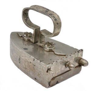 Flachbolzenbügeleisen (Kastenbügeleisen, Reisebügeleisen) aus verzinktem Eisenblech mit schiffförmigem Rumpf. In den Rumpf kann ein erhitzter Bolzen von hinten eingeführt werden. Mit diesem wird der Boden des Bügeleisens erhitzt. Der Innenraum kann mit einer Klappe verschlossen werden, sodass der Eisenkeil nicht nach hinten herausfallen kann. Als Griff dient ein Metallband. Es ist mit zwei mit Ornamenten verzierten Schrauben am Eisen befestigt und läuft in zwei dekorativen Blättern aus. Im Inneren des Eisens befindet sich eine S-förmige Rippe die verhindert, dass der Eisenkeil direkt auf dem Boden aufliegt und der Boden des Eisens zu heiß für das Bügeln wird. Der Bolzen ist leider nicht mehr vorhanden. Oben an der Klappe befindet sich ornamentaler Dekor, oben auf dem Bügel etwas Dekor an den Kanten. Keine Informationen zum Hersteller.