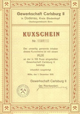 Anteilschein an einem Bergwerk. Eine Gewerkschaft im bergbaurechtlichen Sinne war ein Zusammenschluss von Personen, die eigenwirtschaftlich Bergbau betrieben. Früher war der erste Finder eines Minerals verpflichtet, ein ihm "verliehenes Feld" zu bearbeiten. Überstiegen die dabei anfallenden Kosten die Möglichkeiten des Finders, konnte er mittels der Kuxe das unternehmerische Risiko auf mehrere Schultern verteilen. Im Besitz des Freilichtmuseums Roscheider Hof befinden sich die am 01.12.1931 erstellten Kuxscheine der Gewerkschaft Carlsburg II mit den Nummern 51 bis 59. Es handelt sich dabei um Anteilscheine eines Bergwerks im nordhessischen Dodenau. Der 4seitige Kuxschein besitzt im gefalteten Zustand die Größe DIN A4. Auf der Vorderseite befinden sich in den Ecken der ansprechend gestalteten Umrandung insgesamt vier Bergwerkssymbole. Mittig ist ein handschriftlich auszufüllendes Feld für eine fortlaufende Nummerierung zu finden. Im unteren Bereich ist die Unterschrift des Repräsentanten "Schmallenbach" mit Stempelabdruck (Siegel) angebracht. Das Bergwerk Carlsburg II in Dodenau war in 100 Kuxe aufgeteilt. Die aufklappbaren Innenseiten des Scheins bieten Möglichkeiten zum handschriftlichen Eintrag der Übertragungsvermerke. In unserem Fall wurden die 9 Kux-Scheine von dem Repräsentanten "Schmallenbach" selbst erworben, wie auf der Innenseite am 1.09.1938 bestätigt wurde.