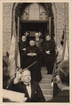 Fotoabzug in schwarz-weiß. Um das Foto ist ein 3 mm weißer Rahmen. Pastor Czecholinski steht auf der Treppe vor dem Haupteingang zur Kirche und hört dem von Mathias Kramprich dirigierten Kirchenchor zu. Die Festgäste warteten auf dem Schulhof, u. a. alle Vereinen mit Vereinsfahnen. Im Bild: v. l.: Dechant Dr. Peters, Pastor Czecholinski, ein franz. Militärpfarrer und sein Adjutant.