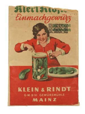 1 Tütchen "Kleri-Einmachgewürz" der Mainzer Gewürzmühle Klein & Rindt. Diese Gewürzmühle befand sich in der Rheinallee und hatte zwischenzeitlich einen prominenten Besitzer. Der spätere Rennfahrer Jochen Rindt wurde 1942 in Mainz geboren und besaß die Gewürzmühle bis 1966. Zuvor führten dessen Eltern, Ilse und Karl Rindt, die Mühle in zweiter Generation. 1970 verunglückte Jochen Rindt bei einem Formel 1 Rennen in Monza tödlich. Posthum wurde er in diesem Jahr noch Weltmeister.