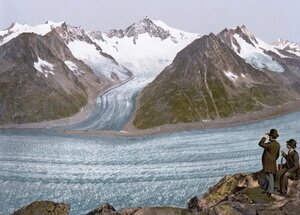 Schulwandbild des Aletschgletschers - größter Gletscher der Alpen - um 1870. Das Bild zeigt vom Eggishorn aus den Großen Aletschgletscher, den (deutlich kleineren) Mittelaletschgletscher. Das Bild zeigt den Höchststand des Gletschers - etwa um 1870. Der Druck ist möglicherweise deutlich später, da der Photochromdruck erst ab 1880 zur Verfügung stand. Nach Eintrag in der DNB stammt der Druck von 1912 oder 1913. Der Große Berg in der Mitte ist das Aletschhorn, eingerahmt vom Geisshorn links und dem Dreieckshorn rechts. Ganz rechts im Hintergrund das Jungfraujoch (heute mit der Bergstantion der Zahnradbahn). Links davon die Jungfrau und rechts davon der Mönch. Ganz links im Hintergrund das Zermatter Weisshorn(?). Im Mittelgrund steht eine Gruppe von Alpinisten in der in der zweiten Hälfte des 19. Jahrhunderts typischen Ausrüstung. Als Vergleich dienen zwei weitere Bilder: 1. Der Photochromdruck um 1900 (mit schon deutlich niedrigeren Gletscherständen. Quelle: Wikimedia Commons, Der Aufnahmestand ist gerningfügig tiefer als bei den anderen beiden Bildern und der Ausschnitt ist etwas kliener (ohne den önche) https://commons.wikimedia.org/wiki/File:Gletscherneu.jpg und dort von LC-DIG-ppmsc-07861 from Library of Congress, Prints and Photographs Division, Photochrom Prints Collection 2. Ein Ausschnitt aus einem Panorama genau dieses Bereichs von dem fast gleichen Standort im Jahr 1900. Man beachte die unterschiedlichen Gletscherstände. Quelle: Wikipedia - Armin Kübelbeck, CC-BY-SA https://creativecommons.org/licenses/by-sa/3.0/ , Wikimedia Commons https://commons.wikimedia.org/wiki/File:Aletschgletscher_2010_v02.jpg