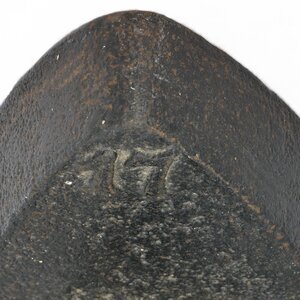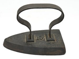 Einfaches Flacheisen. Auf der Oberfläche des Eisens befindet sich an der Spitze die Ziffer 17 als Größenangabe. Das Eisen besitzt einen angeschweißten Bandeisengriff der Rheinischen Form. Zwischen den beiden Bügelbefestigungen befindet sich ein leider nicht mehr lesbares Monogramm. Das leichte Flachbügeleisen gehört zu den massiven Volleisen, die aus Eisen oder Stahl geschmiedet oder gegossen und bereits ab dem 18. Jh. hergestellt wurden. Auf Grund seines geringen Gewichts und seiner flachen Sohle, die nahezu mühelos über die vorher mit Wasser besprengte Wäsche gleitet, erfreute es sich noch weit bis ins 20. Jahrhundert hinein großer Beliebtheit. Das Erhitzen auf dem Kohleofen oder in einer offenen Feuerstelle wie dem Kaminfeuer erforderte jedoch verschiedene Vorsichtsmaßnahmen, um die Bügelwäsche nicht zu beschmutzen oder sich am fest verbundenen Metallgriff zu verbrennen. Viele Büglerinnen wischten daher nach dem Erhitzen des Eisens mit einem Tuch, das sie an ihrer Schürze befestigt hatten, über die Bügelsohle. Als Hitzeschutz wurde oftmals ein dicker Handschuh oder ein Lappen, der um den Griff gewickelt wurde, verwendet.