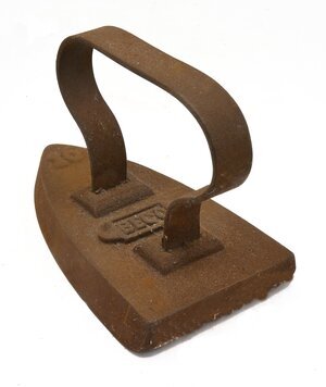 Flacheisen der Marke Beco. Auf der Oberfläche des Eisens befindet sich die Gussmarke G M und an der Spitze die Ziffer 16 als Größenangabe. Das Eisen besitzt einen angeschweißten Bandeisengriff der Rheinischen Form. Das Eisen ist stark verrostet. Das leichte Flachbügeleisen gehört zu den massiven Volleisen, die aus Eisen oder Stahl geschmiedet oder gegossen und bereits ab dem 18. Jh. hergestellt wurden. Auf Grund seines geringen Gewichts und seiner flachen Sohle, die nahezu mühelos über die vorher mit Wasser besprengte Wäsche gleitet, erfreute es sich noch weit bis ins 20. Jahrhundert hinein großer Beliebtheit. Das Erhitzen auf dem Kohleofen oder in einer offenen Feuerstelle wie dem Kaminfeuer erforderte jedoch verschiedene Vorsichtsmaßnahmen, um die Bügelwäsche nicht zu beschmutzen oder sich am fest verbundenen Metallgriff zu verbrennen. Viele Büglerinnen wischten daher nach dem Erhitzen des Eisens mit einem Tuch, das sie an ihrer Schürze befestigt hatten, über die Bügelsohle. Als Hitzeschutz wurde oftmals ein dicker Handschuh oder ein Lappen, der um den Griff gewickelt wurde, verwendet.