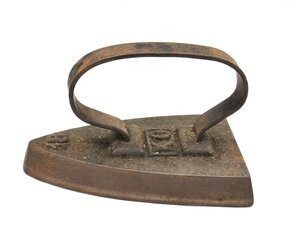 Einfaches Flacheisen. Auf der Oberfläche des Eisens unter dem Griff befinden sich eingerahmt die Gussmarke mit den Initialen K O und an der Spitze die Ziffer 18 als Größenangabe. Das Eisen besitzt einen angeschweißten Bandeisengriff der Rheinischen Form. Das leichte Flachbügeleisen gehört zu den massiven Volleisen, die aus Eisen oder Stahl geschmiedet oder gegossen und bereits ab dem 18. Jh. hergestellt wurden. Auf Grund seines geringen Gewichts und seiner flachen Sohle, die nahezu mühelos über die vorher mit Wasser besprengte Wäsche gleitet, erfreute es sich noch weit bis ins 20. Jahrhundert hinein großer Beliebtheit. Das Erhitzen auf dem Kohleofen oder in einer offenen Feuerstelle wie dem Kaminfeuer erforderte jedoch verschiedene Vorsichtsmaßnahmen, um die Bügelwäsche nicht zu beschmutzen oder sich am fest verbundenen Metallgriff zu verbrennen. Viele Büglerinnen wischten daher nach dem Erhitzen des Eisens mit einem Tuch, das sie an ihrer Schürze befestigt hatten, über die Bügelsohle. Als Hitzeschutz wurde oftmals ein dicker Handschuh oder ein Lappen, der um den Griff gewickelt wurde, verwendet.