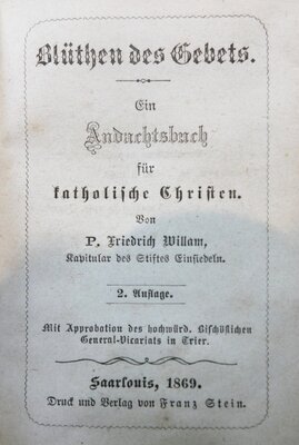 Blüthen des Gebets, Ein Andachtsbuch für kathlische Christen, von P. Friedrich Willam, Kapitular des Stiftes Einsiedeln, 2. Auflage, Saarluis 1869 Vergoldeter Schnitt, Ledereinband, 400 Seiten