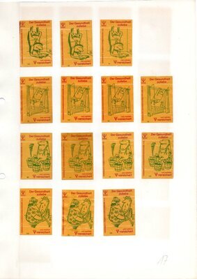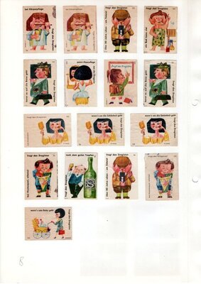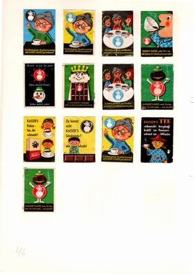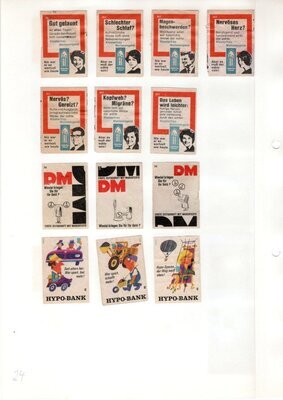 Konvolut von Werbeetiketten für Streichholzschachteln aus Deutschland. Sehr viele Firmen, Vereine, Institutionen, und der Handel erkannten und nutzten die Reichweite dieses Werbemediums. Unser Objekt enthält eine Sammlung solcher Werbetiketten, verschiedener Branchen wie Versicherungen oder Lebensmittelhandel von verschiedenen Jahrgängen. Die Darstellungen umfassen Figuren, Trachten, Wappen, Autos, Lokomotiven, Filmplakate und weiteres. Besonders originell war eine Serie des Hamburger Verkehrsverbunds, aus mehreren Etiketten konnte man einen Streckenplan zusammensetzen. Aufgeklebt auf Karton, in einem Ordner abgeheftet. Alle genannten und abgebildeten Firmennamen, Markennamen und Produktbezeichnungen sind Eigentum ihrer jeweiligen Hersteller und gesetzlich oder vertraglich geschützt. Sie dienen lediglich der Darstellung, der Beschreibung und der eindeutigen Identifikation von Museumseigentum.