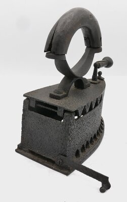 Auffällig bei diesem Eisen sind insgesamt 20 Löchern direkt über dem Boden. Es hat damit die typische Eigenschaft eines Schweizereisens, könnte aber auch (da ohne Rost) als Glühstoffeisen genutzt worden sein. Allerdings besitzt es (noch) nicht die für spätere Glühstoffeisentypischen Rippen im inneren des Eisens. Glühstoff ist eine Art Holzkohlenbrikett, gepulverte Holzkohle, die mit Teer und Natronlauge behandelt in Form gepreßt und verkokt (entgast) wurde. Glühstoff diente zum Kochen, Plätten, Bügeln, Warmhalten etc. Ein sogenannter Glühbolzen wurde zum Bügeln ausserhalb des Eisens angezündet und in das Eisen eingeführt. Er konnte bis zu 10 Stunden ununterbrochen glühen und so das Fortarbeiten ermöglichen. Im Vergleich zum Kohlebügeleisen hat er kaum Staub, Ruß und Giftgase emittiert. Diese Fortschritte wurden nicht nur in Fachzeitschriften ausführlich beworben. In den aufklappbaren Deckel eines Glühstoffeisens konnte der ausserhalb des Eisens angezündete Glühstoff eingefüllt werden. Die Bügelsohle besteht aus dickem Eisenblech, der Glühstoffbehälter besteht aus dünnerem Eisen. Die Bügelsohle ragt in hinteren Teil über den Kohlebehälter heraus. Mit einer Klappe auf der Rückseiten, unten über der Bügelsohle, konnte Asche ausgeschüttet werden. in Holzgriff ist mit Eisenbändern und Nieten am Deckel befestigt. Vor dieser befindet sich ein gusseisener Knauf mit dem der Deckel verschlossen und wieder geöffnet werden konnte. An allen drei Seiten des Bügeleisens befinden sich ganz unten und ganz oben kleine Löcher zur Ermöglichung der Luftzirkulation. Leider keine Informationen zum Hersteller. Bügeleisen werden seit dem 17. Jahrhundert zum Glätten der Wäsche verwendet. Die ersten Bügeleisen bestanden aus einer Metallplatte und einem bügelartigem Griff. Daher auch der Name.