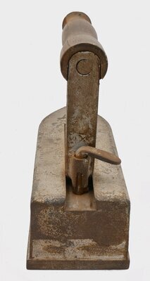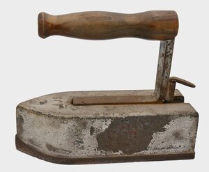 Blockeisen waren sehr schwere Bügeleisen und typische Arbeitsgeräte von Schneidern. Im Gegensatz zum häuslichen Bügeln, das eine typische Frauenarbeit war, wurde diese Bügeleisehn von Männern genutzt. Das Blockeisen ist ein sogenanntes Wechsel-Plättbolzen mit ausklinkbarem Holzgriff, der in eine Rille auf der Oberfläche des Eisens geschoben und dann durch einen Stift, der am Band zum Griff angebracht ist und in ein Loch im Eisen greift, arretiert wird. Der Griff konnte dabei abwechselnd auf mehrere Eisen montiert werden um ein kontinuierliches Bügeln zu ermöglichen. Die gerade nicht gebrauchten Eisen werden dabei auf einem Ofen oder im Feuer erhitzt. An der Spitze des Eisens befindet sich die Größenangabe 8 und dahinter die Buchstaben A J S - höchstwahrscheinlich die Initialen des unbekannten Herstellers. Wie der Name schon sagt, bestehen diese Eisen aus einem Block, Eisen oder Stahl geschmiedet bzw. gegossen. Sie haben ein beträchtliches Gewicht von 3-12 kg und wurden vorwiegend von Schneidern ab etwas Mitte des 18. Jahrhunderts bis ins 20. Jahrhundert benutzt. Das in der Glut des Stubenofens erhitzte schwere Eisen konnte mit dem vorher abgenommenen Griff wieder aus dem Feuer herausgezogen werden und wurde dann auf einer Eisenplatte oder auf dem Fußboden abgestellt. Der Nachteil dieses Eisens ist, dass man beim Einführen und Sichern des Griffs an glühend hei9em Metall herumfummeln muss, was nicht ganz ungefährlich gewesen sein dürfte da das Eisen selber ist extrem schwer ist.