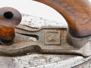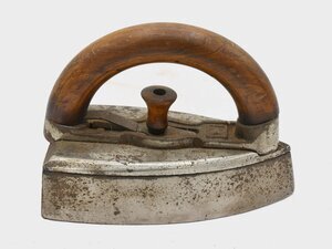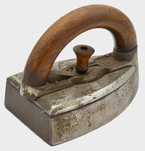 Bügeleisen (Satzeisen) mit halbrundem Holzgriff: Das Bügeleisen besitzt einen ausklinkbaren Holzgriff und wird wegen des Auswechselmechanismus als Satzeisen bezeichnet. Konkret wird durch den Zug am Knopf unter dem Holzgriff ein darunter befindlicher Haken gelöst, der einen Stift im Eisen umfasst und so den Bügel mit dem Eisen verbindet. Mittels eines Druckknopfes lässt sich der Griff lösen. So war es möglich mit mehreren Eisen zu arbeiten. Gussmarke: A - keine weiteren Informationen zum Hersteller Satzeisen gehen auf ein amerikanisches Patent aus dem Jahre 1871 zurück. Sie besitzen eine mit Asbest isolierte Bügeleisendecke und einen ausklinkbaren Holzgriff den man auf auf eines der meist 4 Eisen klemmen konnte. Im Laufe der Zeit entwickelten die Hersteller viele verschiedene Klemmmechanismen. Vor dem Bügeln wurde das Eisen auf einem Herd erhitzt und anschließend der Holzgriff aufgesetzt, um die Wäsche zu glätten. Beim Bügeln werden mehrere Eisen gleichzeitig auf einem Ofen aufgeheizt. Ein Eisen wird an den Griff geklemmt und mit diesem wird gebügelt. Wird das Eisen im Laufe der Zeit zu kalt, so wird der Griff abgeklemmt und an ein anderes, heißes angeklemmt. Sofort kann dann mit diesem gebügelt werden und das erkaltete Unterteil wird auf den Herd gestellt. Satzeisen setzten sich schnell durch, da sie im Vergleich zu Bolzeneisen viel einfacher und sicherer zu bedienen waren. Auch nach der Elektrifizierung waren sie auch aus Sparsamkeitsgründen noch lange in Gebrauch.