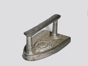 Französisches Flacheisen Marke "J MANIL". Auf der Oberfläche des Eisens ist dessen Schriftzug in Großbuchstaben und dessen als Gussmarke dienendes Wappen zu sehen. Das Wappen besteht aus einem gestreiften Schild, das von Perlenstäben eingerahmt wird. Das Eisen besitzt einen eisernen Griff der waagrecht auf zwei ebenfalls aus Eisen bestehenden Säulen ruht, die im Eisen angegossen wurde. Links der hinteren Säule finden sich die Buchstaben "No" und rechts davon die Zahl "5". Offensichtlich die Größenangabe. Das Erhitzen des Eisens auf dem Kohleofen oder in einer offenen Feuerstelle wie dem Kaminfeuer erforderte verschiedene Vorsichtsmaßnahmen, um die Bügelwäsche nicht zu beschmutzen oder sich am mit dem Eisen fest verbundenen Metallgriff zu verbrennen. Viele Büglerinnen wischten daher nach dem Erhitzen des Eisens mit einem Tuch, das sie an ihrer Schürze befestigt hatten, über die Bügelsohle. Als Hitzeschutz wurde oftmals ein dicker Handschuh oder ein Lappen, der um den Griff gewickelt wurde, verwendet.