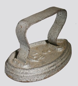 Flachbügeleisen mit Eisenbügel im Rheinischen Stil und gerader und flacher Oberseite. Auf der Oberseite des Eisens befinden sich die Zahl (Größenangabe) 3, darunter über einem Halbmond die Initialen LT des Herstellers. Um die Oberseite des Eisens läuft am Rand ein Wulst. Der eiserne Bügel besteht aus einem an 2 Stellen auf dem Eisen angeschweisten Eisenband. Es handelt sich um ein einfaches Flacheisen, das auf der Herdplatte oder an einem Bügeleisenofen erhitzt werden musste. Das leichte Flachbügeleisen gehört zu den massiven Volleisen, die aus Eisen oder Stahlgeschmiedet oder gegossen und bereits ab dem 18. Jh. hergestellt wurden. Auf Grund seines geringen Gewichts und seiner flachen Sohle, die nahezu mühelos über die vorher mit Wasser besprengte Wäsche gleitet, erfreute es sich noch weit bis ins 20. Jahrhundert hinein großer Beliebtheit. Das Erhitzen auf dem Kohleofen oder in einer offenen Feuerstelle wie dem Kaminfeuer erforderte jedoch verschiedene Vorsichtsmaßnahmen, um die Bügelwäsche nicht zu beschmutzen oder sich am fest verbundenen Metallgriff zu verbrennen. Viele Büglerinnen wischten daher nach dem Erhitzen des Eisens mit einem Tuch, das sie an ihrer Schürze befestigt hatten, über die Bügelsohle. Als Hitzeschutz wurde oftmals ein dicker Handschuh oder ein Lappen, der um den Griff gewickelt wurde, verwendet.