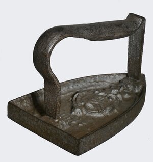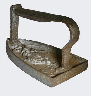 Französisches dessen Gussmarke auf der Oberfläche des Eisens zu sehen ist. Das Eisen besitzt einen auf dem Eisen angegossenem Bügelgriff in Nasenform. Auf der Oberseite des Eisens ist der Firmenname LEMION . Darüber ein neobarockes Wappen in einer Rocaille als Gussmarke. Das Erhitzen des Eisens auf dem Kohleofen oder in einer offenen Feuerstelle wie dem Kaminfeuer erforderte verschiedene Vorsichtsmaßnahmen, um die Bügelwäsche nicht zu beschmutzen oder sich am mit dem Eisen fest verbundenen Metallgriff zu verbrennen. Viele Büglerinnen wischten daher nach dem Erhitzen des Eisens mit einem Tuch, das sie an ihrer Schürze befestigt hatten, über die Bügelsohle. Als Hitzeschutz wurde oftmals ein dicker Handschuh oder ein Lappen, der um den Griff gewickelt wurde, verwendet.