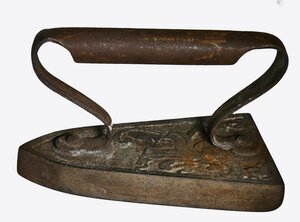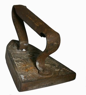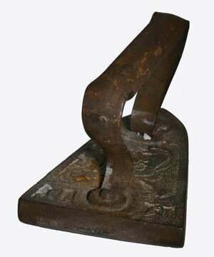 Französisches Flacheisen dessen Gussmarke auf der Oberfläche des Eisens zu sehen ist. Das Eisen besitzt einen auf dem Eisen angenieteten Metallbügel-Griff. Die Oberseite des Eisens ist mit einem Blatt und Rankendekor geschmückt. In deren Mitte befindet sich als Inschrift die Größenangabe 15. Die Initialen des Herstellers (?) "A A" befinden sich neben der hinteren Befestigung des Bügels. Das Erhitzen des Eisens auf dem Kohleofen oder in einer offenen Feuerstelle wie dem Kaminfeuer erforderte verschiedene Vorsichtsmaßnahmen, um die Bügelwäsche nicht zu beschmutzen oder sich am mit dem Eisen fest verbundenen Metallgriff zu verbrennen. Viele Büglerinnen wischten daher nach dem Erhitzen des Eisens mit einem Tuch, das sie an ihrer Schürze befestigt hatten, über die Bügelsohle. Als Hitzeschutz wurde oftmals ein dicker Handschuh oder ein Lappen, der um den Griff gewickelt wurde, verwendet.