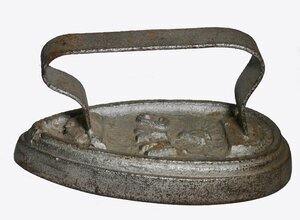 Flachbügeleisen mit angegossenem Eisenbügel im Rheinischen Stil und gerader und flacher Oberseite. Auf der Oberseite des Eisens befinden sich die Zahl (Größenangabe) 4, darüber die Initialen NYC des Herstellers. Um die Oberseite des Eisens läuft am Rand ein Wulst. Der eiserne Bügel besteht aus einem an 2 Stellen auf dem Eisen angeschweisten Eisenband. Es handelt sich um ein einfaches Flacheisen, das auf der Herdplatte oder an einem Bügeleisenofen erhitzt werden musste. Das leichte Flachbügeleisen gehört zu den massiven Volleisen, die aus Eisen oder Stahlgeschmiedet oder gegossen und bereits ab dem 18. Jh. hergestellt wurden. Auf Grund seines geringen Gewichts und seiner flachen Sohle, die nahezu mühelos über die vorher mit Wasser besprengte Wäsche gleitet, erfreute es sich noch weit bis ins 20. Jahrhundert hinein großer Beliebtheit. Das Erhitzen auf dem Kohleofen oder in einer offenen Feuerstelle wie dem Kaminfeuer erforderte jedoch verschiedene Vorsichtsmaßnahmen, um die Bügelwäsche nicht zu beschmutzen oder sich am fest verbundenen Metallgriff zu verbrennen. Viele Büglerinnen wischten daher nach dem Erhitzen des Eisens mit einem Tuch, das sie an ihrer Schürze befestigt hatten, über die Bügelsohle. Als Hitzeschutz wurde oftmals ein dicker Handschuh oder ein Lappen, der um den Griff gewickelt wurde, verwendet.