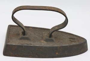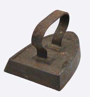 Einfaches, reativ dickes und schweres spitz zulaufendes Flacheisen mit aufgerauter Oberfläche. Am hinteren Ende des Eisens befinden sich die Initialen K O und an der Spitze Größenangabe "19". Das Eisen besitzt einen angeschweißten Bandeisengriff der Rheinischen Form. Das relativ leichte Flachbügeleisen gehört zu den massiven Volleisen, die aus Eisen oder Stahl geschmiedet oder gegossen und bereits ab dem 18. Jh. hergestellt wurden. Auf Grund seines geringen Gewichts und seiner flachen Sohle, die nahezu mühelos über die vorher mit Wasser besprengte Wäsche gleitet, erfreute es sich noch weit bis ins 20. Jahrhundert hinein großer Beliebtheit. Das Erhitzen auf dem Kohleofen oder in einer offenen Feuerstelle wie dem Kaminfeuer erforderte jedoch verschiedene Vorsichtsmaßnahmen, um die Bügelwäsche nicht zu beschmutzen oder sich am fest verbundenen Metallgriff zu verbrennen. Viele Büglerinnen wischten daher nach dem Erhitzen des Eisens mit einem Tuch, das sie an ihrer Schürze befestigt hatten, über die Bügelsohle. Als Hitzeschutz wurde oftmals ein dicker Handschuh oder ein Lappen, der um den Griff gewickelt wurde, verwendet.