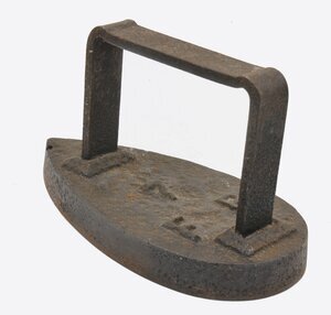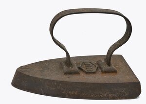 Einfaches, tropfenförmiges Flacheisen. Auf der Oberfläche des Eisens befindet sich die Größenangabe "7" und es befinden sich mit "F B" die Initialen des Herstellers. Der nahezu rechteckige Bügel ist auf dem Eisen angeschweisst. Das tropfenförmige Flacheisen gehört zu den massiven Volleisen, die aus Eisen oder Stahl geschmiedet oder gegossen und bereits ab dem 18. Jh. hergestellt wurden. Auf Grund seines geringen Gewichts und seiner flachen Sohle, die nahezu mühelos über die vorher mit Wasser besprengte Wäsche gleitet, erfreute es sich noch weit bis ins 20. Jahrhundert hinein großer Beliebtheit. Der nach em Aufheizen des Eisens auch glühend heíße Bügel konnte nur mit einem nassen Lappen oder einem mobilen Holzgriff, der über das Dach des Bügels geklappt wurde, angefasst werden.
