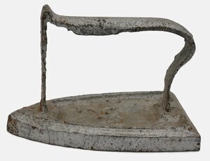 Sehr einfaches, wahrscheinlich französisches Flacheisen. Keine Angaben auf der Oberfläche des Eisens. Der Bügel mit Nase ist auf dem Eisen angeschweisst. Kein (noch lesbarer) Hinweis auf den Hersteller. Das Flacheisen gehört zu den massiven Volleisen, die aus Eisen oder Stahl geschmiedet oder gegossen und bereits ab dem 18. Jh. hergestellt wurden. Auf Grund seines geringen Gewichts und seiner flachen Sohle, die nahezu mühelos über die vorher mit Wasser besprengte Wäsche gleitet, erfreute es sich noch weit bis ins 20. Jahrhundert hinein großer Beliebtheit. Der nach em Aufheizen des Eisens auch glühend heíße Bügel konnte nur mit einem nassen Lappen oder einem mobilen Holzgriff, der über das Dach des Bügels geklappt wurde, angefasst werden.
