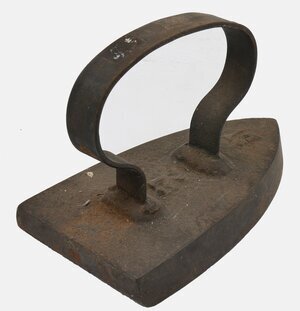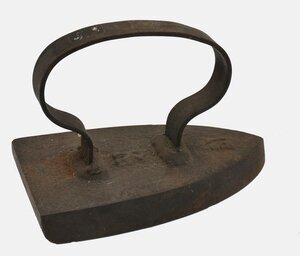 Spitz zulaufendes Flachbügeleisen mit angegossenem Eisenbügel im Rheinischen Stil,. An der Spitze befindet sich als Größenangabe die Zahl "17", zwischen den beiden Bügelbefestigungen der Buchstabe K. Die gerundete Bügelsohle zeichnet es als Glanzbügeleisen zum Bügeln von hohen Krägen, Batistblusen etc. aus. Es handelt sich um ein einfaches Flacheisen, das auf der Herdplatte oder an einem Bügeleisenofen erhitzt werden musste. Das leichte Flachbügeleisen gehört zu den massiven Volleisen, die aus Eisen oder Stahlgeschmiedet oder gegossen und bereits ab dem 18. Jh. hergestellt wurden. Auf Grund seines geringen Gewichts und seiner flachen Sohle, die nahezu mühelos über die vorher mit Wasser besprengte Wäsche gleitet, erfreute es sich noch weit bis ins 20. Jahrhundert hinein großer Beliebtheit. Das Erhitzen auf dem Kohleofen oder in einer offenen Feuerstelle wie dem Kaminfeuer erforderte jedoch verschiedene Vorsichtsmaßnahmen, um die Bügelwäsche nicht zu beschmutzen oder sich am fest verbundenen Metallgriff zu verbrennen. Viele Büglerinnen wischten daher nach dem Erhitzen des Eisens mit einem Tuch, das sie an ihrer Schürze befestigt hatten, über die Bügelsohle. Als Hitzeschutz wurde oftmals ein dicker Handschuh oder ein Lappen, der um den Griff gewickelt wurde, verwendet.