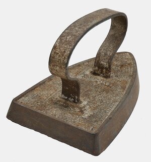Relativ dickes Flacheisen mit aufgerauter Decke besitzt angeschweißte Eisenbügel im Rheinischen Stil. Kein Hinweis auf den Hersteller. Es handelt sich um ein einfaches Flacheisen, das auf der Herdplatte oder an einem Bügeleisenofen erhitzt werden musste. Das leichte Flachbügeleisen gehört zu den massiven Volleisen, die aus Eisen oder Stahlgeschmiedet oder gegossen und bereits ab dem 18. Jh. hergestellt wurden. Auf Grund seines geringen Gewichts und seiner flachen Sohle, die nahezu mühelos über die vorher mit Wasser besprengte Wäsche gleitet, erfreute es sich noch weit bis ins 20. Jahrhundert hinein großer Beliebtheit. Das Erhitzen auf dem Kohleofen oder in einer offenen Feuerstelle wie dem Kaminfeuer erforderte jedoch verschiedene Vorsichtsmaßnahmen, um die Bügelwäsche nicht zu beschmutzen oder sich am fest verbundenen Metallgriff zu verbrennen. Viele Büglerinnen wischten daher nach dem Erhitzen des Eisens mit einem Tuch, das sie an ihrer Schürze befestigt hatten, über die Bügelsohle. Als Hitzeschutz wurde oftmals ein dicker Handschuh oder ein Lappen, der um den Griff gewickelt wurde, verwendet.