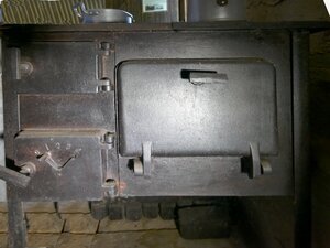 Schwarzer Herd für Bombengeschädigte mit einem Ofenrohr, hergestellt aus amerikanischen Munitionsbehältern. Der Herd steht auf 4 Füßen. Links oben die Klappe zum Einbringen des Brennguts. Darunter die Tür zur Brennkammer mit einer Klappe zur Regulierung der Luftzufuhr. Rechts über 2/3 der Breite das Bratrohr. Der Ofen diente gleichzeitig zum Kochen als Heizung. Keine Angaben zum Hersteller.