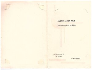 Zu sehen ist ein Mädchen im Kommunionskleid. Sie trägt ein weißes Kleid und weiße Schuhe. Ein weißer Schleiher fällt fast bis zu den Handgelenken. Die linke Hand hält ein Gebetsbuch, während die Rechte eine Tasche trägt. Das Kind steht fest auf dem rechten Fuß. Beim Linken ist die Ferse etwas angehoben. Das Foto steckt in einer kleinen Fototasche. Auf deren vorderen Deckel sind der Name und der Sitz des Fotoateliers vermerkt.