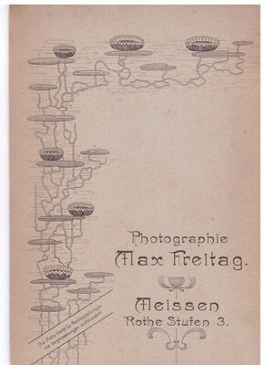 Zu sehen sind ein Mädchen und ein Junge. Das Mädchen ist älter. Es trägt ein Kommunionskleid und steht seitlich zum Jungen, ist diesem aber zugewandt. Der Junge sitzt auf einem Stuhl und hat die Beine übereinander gesachlagen. Auf seinem Schoss liegt ein geöffnetes Buch. Das Mädchen hat seine Hand auf einen kleinen Tisch gelegt. Auf diesem liegen eine Schirmmütze und ein Buch. Das Foto ist auf ein Stück Pappe geklebt. Auf der Rückseite sind der Name und der Sitz des Fotoateliers vermerkt.