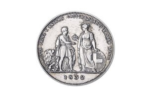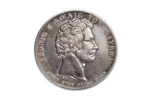 Die Münze zeigt auf dem Avers Hellas als allegorische Frauengestalt mit griechischem Wappenschild, die dem stehenden Prinzen Otto eine Krone überreicht. Der Prinz ist in einem antiken Stil mit Sandalen und Gewand und in Begleitung einer Symbolfigur, des bayerischen Löwen, dargestellt. Der umlaufende Text lautet "Otto Prinz v. Bayern Griechenlands erster Koenig". Der Revers zeigt König Ludwig I. im Profil. Nach den Unabhängigkeitskriegen gegen das Osmanische Reich wurde Griechenland als Königreich international anerkannt und der bayerische Prinz Otto (1815-1867) 1832 zum König ernannt. Otto wurde von seinem Vater Ludwig I. finanziell und militärisch unterstützt, der seiner Griechenlandbegeisterung auf diese Weise auch politischen Ausdruck verlieh. Bei den sogenannten Geschichtstalern handelt es sich um 38 Münzen, die Ludwig I. im Laufe seiner Regierungszeit (1825-1848) schlagen ließ. Mit ihnen schuf er etwas zu dieser Zeit in Europa einzigartiges. Er verfolgte dabei das Anliegen, patriotische Gefühle zu stärken und die Öffentlichkeit an das Königshaus zu binden. Die Taler reihen sich in die königlichen Denkmalstiftungen ein und entsprechen auch der zeitgenössischen Hinwendung zum Historischen, wobei ebenso aktueller landeswichtiger Ereignisse gedacht werden sollte. Die Geschichtstaler nutzte Ludwig I. gekonnt, um sich und seine Familie ins Bild zu setzen. Die Darstellungen verweisen auf die Fortschritte Bayerns unter seiner Regentschaft im Bereich der Gesetzgebung, Infrastruktur, des Handels und des Bildungswesens. Die glückliche Verbindung von Tradition und Fortschritt ergibt sich im Überblick der einzelnen Taler, die sowohl die Verbindungen zur katholischen Kirche als auch die Förderung moderner Vorhaben wie der Eisenbahn als gedenkwürdig herausheben. Ludwig verweist auf die von ihm gestifteten Denkmäler zu Ehren der bayerischen Armee sowie verdienter Persönlichkeiten des Landes, darunter Vertreter aus Kunst und Literatur, womit er sie in doppelter Weise ins Gedächtnis der Bürgerinnen und Bürger einschreibt. Die Geschichtstaler wurden mitunter auch zur Kommunikation mit den Untertanen verwendet, so bedankte sich Ludwig in monarchischer Manier mittels einer Münzprägung von 1830 für die Treue der Bayern während der französischen Unruhen. Die propagandistische Absicht, patriotische Umlaufmünzen zu schaffen, erfüllte sich nicht, da die Geschichtstaler nur in geringen Auflagen geprägt wurden und eher bei Sammlern beliebt waren und weniger im Zahlungsverkehr genutzt wurden.