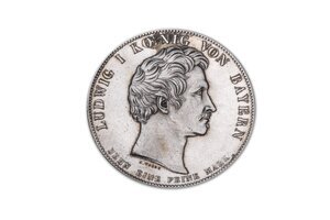 Bavaria, als Verkörperung des bayerischen Staates, übergibt zwei kleine Jungen in die Obhut eines Benediktinermönchs in seiner Kutte. In dem umlaufenden Text heißt es erläuternd: "Den Benediktinern wieder eine Lehranstalt übergeben". Bavaria ist in Mantel und Helm gekleidet, der an die Hartschiere der königlichen Leibgarde erinnert. Der Mönch wird mit einem Buch als Attribut und in dozierender Haltung als Wissensvermittler dargestellt. Der Revers zeigt König Ludwig I. im Profil. Der Geschichtstaler wurde anlässlich der Übergabe des 1828 gegründeten königlich-bayerischen Augsburger Gymnasiums St. Stephan an die Benediktiner 1835 geprägt. Er ist Ausdruck von Ludwigs I kirchlicher Restaurationspolitik, in deren Folge zahlreiche Klöster, die in der Säkularisation 1803 verstaatlicht worden waren, wieder eingerichtet wurden.1835 gründete Ludwig I. die Abtei St. Stephan und betraute die Benediktinermönche mit der Leitung der Schule. Er war mit dem Ideal eines katholisch-patriarchalen Herrschertums erzogen worden. Im gleichen Jahr ließ der König den Grundstein für die Benediktiner-Abtei St. Bonifaz in München legen. Die Kirche sollte zur Grablege für ihn und seine Frau Therese werden. Bei den sogenannten Geschichtstalern handelt es sich um 38 Münzen, die Ludwig I. im Laufe seiner Regierungszeit (1825-1848) schlagen ließ. Mit ihnen schuf er etwas zu dieser Zeit in Europa einzigartiges. Er verfolgte dabei das Anliegen, patriotische Gefühle zu stärken und die Öffentlichkeit an das Königshaus zu binden. Die Taler reihen sich in die königlichen Denkmalstiftungen ein und entsprechen auch der zeitgenössischen Hinwendung zum Historischen, wobei ebenso aktueller landeswichtiger Ereignisse gedacht werden sollte. Die Geschichtstaler nutzte Ludwig I. gekonnt, um sich und seine Familie ins Bild zu setzen. Die Darstellungen verweisen auf die Fortschritte Bayerns unter seiner Regentschaft im Bereich der Gesetzgebung, Infrastruktur, des Handels und des Bildungswesens. Die glückliche Verbindung von Tradition und Fortschritt ergibt sich im Überblick der einzelnen Taler, die sowohl die Verbindungen zur katholischen Kirche als auch die Förderung moderner Vorhaben wie der Eisenbahn als gedenkwürdig herausheben. Ludwig verweist auf die von ihm gestifteten Denkmäler zu Ehren der bayerischen Armee sowie verdienter Persönlichkeiten des Landes, darunter Vertreter aus Kunst und Literatur, womit er sie in doppelter Weise ins Gedächtnis der Bürgerinnen und Bürger einschreibt. Die Geschichtstaler wurden mitunter auch zur Kommunikation mit den Untertanen verwendet, so bedankte sich Ludwig in monarchischer Manier mittels einer Münzprägung von 1830 für die Treue der Bayern während der französischen Unruhen. Die propagandistische Absicht, patriotische Umlaufmünzen zu schaffen, erfüllte sich nicht, da die Geschichtstaler nur in geringen Auflagen geprägt wurden und eher bei Sammlern beliebt waren und weniger im Zahlungsverkehr genutzt wurden.