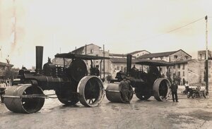Schwarz-Weiß-Aufnahmen aus dem Jahre 1925. Auf dem ersten Bild sind 2 hintereinander stehende sogenannte Verbundmaschinen abgebildet. Diese tragen die Typenbezeichnung DV. Es handelt um dreirädrige Straßenwalzen. Als Verbundmaschinen werden Dampfmaschinen bezeichnet, bei denen zwei oder bis zu vier Zylindereinheiten nacheinander angebracht sind. Nachdem in der ersten Zylindereinheit mittels Dampf ein gewisser Druck entstanden ist und für einen Vortrieb des Fahrzeugs gesorgt hat, wird der restliche noch nicht entwichene Dampf in den nächsten Zylinder geleitet und damit ein weiterer Vortrieb generiert. Die so erzeugte Kraft wurde über eine links am Fahrerhaus angebrachte Riemenscheibe auf die Antriebsachse übertragen. Auf dem Bild ist neben einzelnen Personen auch ein an die zweite Dampfwalze mit einer Kette angehängter sogenannter Straßenaufreißer zu erkennen. Dieses von der Firma Zettelmeyer produzierte Gerät verfügte über keinen eigenen Antrieb. Es wurde zum Abbau vorhandener Straßenbeläge eingesetzt. Ein entsprechendes Fahrzeug befindet sich im Freigelände des Freilichtmuseums im Bereich des Güterschuppens. Die nächste Aufnahme zeigt zwei weitere Dampfwalzen der Firma Zettelmeyer. Abgebildet sind neben den jeweiligen Fahrzeugführern mehrere in Anzügen gekleidete Personen, die neben der auf der linken Seite platzierten Walze stehen. Bei dieser Walze ist im Bereich des Bügels der vorderen Fahrzeugachse deutlich die Bezeichnung "Zettelmeyer Konz Trier" zu erkennen.
