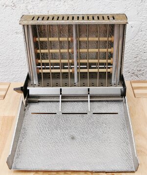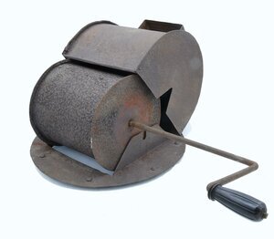 Das Gerät dient zum Rösten von Kaffe (oder entsprechendem Kaffeeersatz) und besteht aus einer minimalen Aussenhülle die weniger als die Hälftre des "Innenlebens" umschließt sowie einer breiten runden Leiste darunter. Diese ermöglicht es das ganze "Gerät" auf ein Loch der Herdplatte eines traditionellen Küchenherds zu stellen und so den Kaffe zu rösten. Das Innere besteht im Wesentlichen aus einem Netz in Kugelform. Aus dem Gerät ragen zwei lange Stiele mit je einem Holzgriff. Mi dem Griff am kürzeren Stiel kann man das ganze Gerät bewegen, mit dem anderen die Netzkugel drehen.