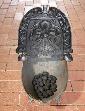 Kohlenfrosch (Kohlebecken) mit Blattdekor. Der Kohlenfrosch stand normalerweise neben dem Kohleofen um nicht bei jedem Nachschüren in den Kohlenkeller gehen zu müssen. Er besitzt 3 Füße. Etwa 3/4 des Deckels sind aufklappbar, um in das darunterliegende Gefäß Kohlen hineinzuschütten bzw. wieder heraus nehmen zu können.
