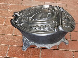 Kohlenfrosch (Kohlebecken) mit Muschel und Rankem Dekor. Der Kohlenfrosch stand normalerweise neben dem Kohleofen um nicht bei jedem Nachschüren in den Kohlenkeller gehen zu müssen. Er besitzt 3 Füße. Etwa 2/3 des Deckels sind aufklappbar um in das darunterliegende Gefäß Kohlen hineinzuschütten bzw. wieder heraus nehmen zu können.