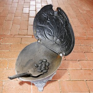 Kohlenfrosch (Kohlebecken) mit Muschel und Rankem Dekor. Der Kohlenfrosch stand normalerweise neben dem Kohleofen um nicht bei jedem Nachschüren in den Kohlenkeller gehen zu müssen. Er besitzt 3 Füße. Etwa 2/3 des Deckels sind aufklappbar um in das darunterliegende Gefäß Kohlen hineinzuschütten bzw. wieder heraus nehmen zu können.