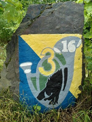 Parforcehorn (oder Trompe de Chasse) in Es. Es besitzt einen tiefen für Frankreich typischen Stimmton (etwa einen Halbton tiefer als moderne Stimmung). Das Parforcehorn besteht aus einer annähernd zylindrischen Röhre aus Messing, die zum Ende hin konisch in eine ausladende Stürze (Schallbecher) ausläuft. Das Horn ist zweiwindig, d.h. es hat zwei Windungen. Es besitzt keine Umwicklung mit Lederriemen. Das Horn ist spielbar. In der Obertonreihe können auf dem Horn 16 verschiedene Naturtöne erzeugt werden. Durch Stopfen können weitere Halbtöne erreicht werden. Der Tiefste Ton ist das Kontra Es, das aber normal nicht verwendet wird und sehr schwierig zu spielen ist. Tiefster verwendeter Ton ist das Es. Notiert werden die Noten in C-Dur, d.h. eine Sexte höher. Das Instrument hat eine Windungslänge von 4,15 m. Das Instrument war ein persönliches Geschenk des Kommdeurs des damals in Saarburg (Deutschland) stationierten "16e bataillons der Chasseurs à pied" an Dr. Ulrich Haas, den damaligen Museumsleiter des Freilichtmuseums Roscheider Hof anläßlich eines Festakts im Freigelände des Museums. Aus seinem Nachlass kam das Horn in das Museum, das er 30 Jahre lang geleitet hat. Das dritte Foto zeigt das aus einen Stein gemalte Abzeichen dieses Batalions vor seiner ehemaligen Kaserne in Saarburg (Stand Juli 2023). Das Batallion wurde 2010 nach Biche verlegt.