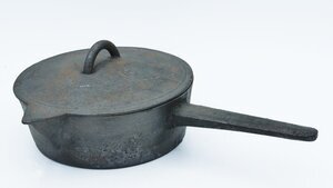 Flacher Kochtopf aus Eisen mit Stiel, Ausgießer und Deckel. Der sehr lange Stiel ist am eigentlichen Topf angeschweißt. Auf dem Deckel ist ein ebenfalls angeschweißter Griff und die Zahl 6 angebracht.
