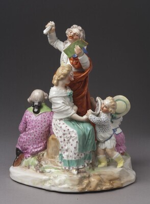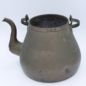 Bauchige Kaffeekanne mit an zwei Scharnieren angebrachtem Bügelgriff und angeschweißtem Ausguss. Deckel wahrscheinlich verloren. Oben am Hals der Kanne befindet sich eine Punze: Links eine "8", in der Mitte eine Krone und über dieser ein kleiner Kreis, rechts die übereinander gestempelten Ziffern 5 und 7 (für das Jahr 1857 ?) oder ein Fuchs.