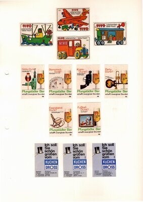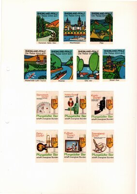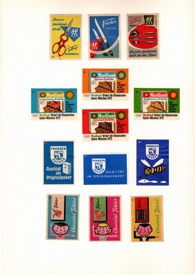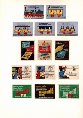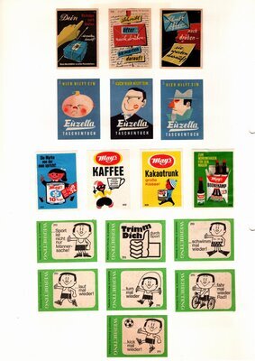 Konvolut von Werbeetiketten für Streichholzschachteln aus Deutschland. Sehr viele Firmen, Vereine, Institutionen, und der Handel erkannten und nutzten die Reichweite dieses Werbemediums. Unser Objekt enthält eine Sammlung solcher Werbeetiketten von heute noch existierenden Marken wie Edeka, Rewe, Spar und BMW sowie zahlreichen ehemals bekannten und inzwischen weitgehend verschwundenen Marken wie Tengelmann, Kaiser's Kaffee, Karstadt sowie weiterer wenig bekannter Herausgeber. Aber auch das Land Rheinland-Pfalz ist vertreten. Die Darstellungen umfassen Sehenswürdigkeiten, Musikinstrumente, Autos, Werbegrafiken und weiteres. Überwiegend handelt es sich um Etiketten von Einzelschachteln sowie teilweise von Umverpackungen. Aufgeklebt auf hellem Karton; in einem Ordner abgeheftet. Alle genannten und abgebildeten Firmennamen, Markennamen und Produktbezeichnungen sind Eigentum ihrer jeweiligen Hersteller und gesetzlich oder vertraglich geschützt. Sie dienen lediglich der Darstellung, der Beschreibung und der eindeutigen Identifikation von Museumseigentum.