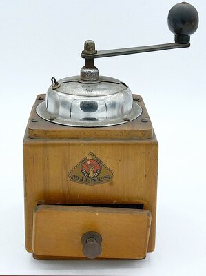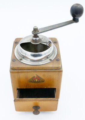 Die Kegelmühle wurde aus lackiertem Buchenholz gefertigt. Auf der Frontseite der Mühle befindet sich ein Aufkleber mit Markennamen und Markenlogo. Die Bohnen werden bei dieser Mühle oben in eine vernickelte Kuppel eingefüllt und fallen dabei in einen Blechtrichter. Das unterstellige (d.h. der Mahlgrad wird wird von unten geregelt) Kegelmahlwerk ist bei dieser Mühle die Variante für "normal" gemahlenen Kaffe. Alternativ konnte die Kaffeemühle auch mit einem Mahlwerk für feingemahlenen Mocca erworben werden. Unter dem Mahlwerk befindet sich eine hölzerne Schublade mit schwarzem Kuststoffgriff in die das Kaffeepulver nach dem Mahlvorgang fällt. Das Mahlwerk wird mit einer Kurbel die sich auf diesem und oberhalb der Kuppel befindet händisch angetrieben. Die Kurbel besitzt einen flachen Stiel mit eingraviertem Markennamen und einen Holzgriff.