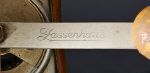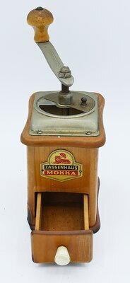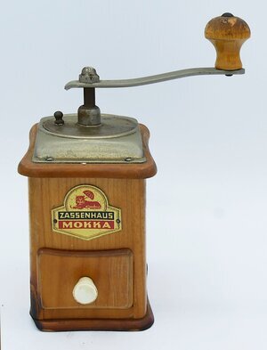 Kaffeemühle der Firma Zassenhaus. Die Kaffemühle dient dazu Kaffebohnen zu zerkleinern. Die Bohnen werden oben in die Mühle geschüttet, durch Drehen der Kurbel im Mahlwerk gequetscht und zerkleinert. Sie fallen aus dem Mahlwerk in die darunterliegende Schublade mit weißem Griff und können dort entnommen werden. Der hölzerne Körper der Kegelmühle besteht aus Kirschholz und Ahorn. Die Mühle besitzt ein unterstelliges (d.h. der Mahlgrat wird unterhab des Mahlwerks eingestellt) Mokka-Mahlwerk. D.h. ein Mahlwerk das die Kaffebohnen speziell fein mahlt. Logo und Schriftzug des Herstellers auf einem Blechschild an der Frontseite der Mühle. Name des Herstellers auf dem leicht geschwungenen Bügel der Kurbel.