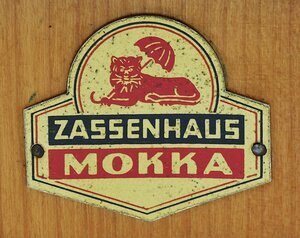 Kaffeemühle der Firma Zassenhaus. Die Kaffemühle dient dazu Kaffebohnen zu zerkleinern. Die Bohnen werden oben in die Mühle geschüttet, durch Drehen der Kurbel im Mahlwerk gequetscht und zerkleinert. Sie fallen aus dem Mahlwerk in die darunterliegende Schublade mit weißem Griff und können dort entnommen werden. Der hölzerne Körper der Kegelmühle besteht aus Kirschholz und Ahorn. Die Mühle besitzt ein unterstelliges (d.h. der Mahlgrat wird unterhab des Mahlwerks eingestellt) Mokka-Mahlwerk. D.h. ein Mahlwerk das die Kaffebohnen speziell fein mahlt. Logo und Schriftzug des Herstellers auf einem Blechschild an der Frontseite der Mühle. Name des Herstellers auf dem leicht geschwungenen Bügel der Kurbel.