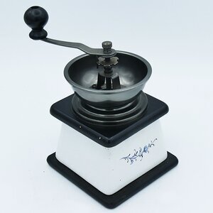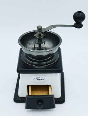 Moderne Retro Kaffeemühle. Dieses Modell wurde ab dem Jahr 2000 in großer Stückzahl und in verschiedenen Varianten von asiatischen Herstellern angeboten. Heute (2023) ist es ab 5,00 € neu und gebraucht auf den einschlägigen Kleinanzeigenplattformen zu finden. Es ist (fast) ein reines Ausstellungsstück. Das Mahlwerk zerkleinert Kaffeebohnen, aber von einem gleichmäßigen Kaffeepulver kann nicht die Rede sein. Es ist auch nicht für den dauerhaften Gebrauch gedacht. Dafür ist es qualitativ zu minderwertig hergestellt. Auch das Gehäuse dürfte einer regelmäßigen Benutzung kaum standhalten.