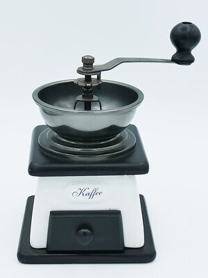 Moderne Retro Kaffeemühle. Dieses Modell wurde ab dem Jahr 2000 in großer Stückzahl und in verschiedenen Varianten von asiatischen Herstellern angeboten. Heute (2023) ist es ab 5,00 € neu und gebraucht auf den einschlägigen Kleinanzeigenplattformen zu finden. Es ist (fast) ein reines Ausstellungsstück. Das Mahlwerk zerkleinert Kaffeebohnen, aber von einem gleichmäßigen Kaffeepulver kann nicht die Rede sein. Es ist auch nicht für den dauerhaften Gebrauch gedacht. Dafür ist es qualitativ zu minderwertig hergestellt. Auch das Gehäuse dürfte einer regelmäßigen Benutzung kaum standhalten.