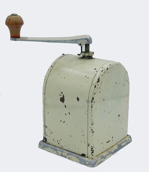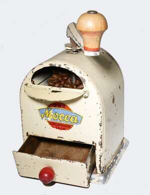 Kaffemühle für fein gemahlenen Kaffee - geeignet für Mocca etc. Die Mühle ist vollständig aus weiß emailliertem Eisenblech gefertigt. Die Kaffemühle dient dazu Kaffebohnen zu zerkleinern. Die Bohnen werden in die Mühle geschüttet, durch Drehen der Kurbel im Mahlwerk gequetscht und zerkleinert. Sie fallen aus dem Mahlwerk in die darunterliegende Schublade mit rotem Griff und können dort entnommen werden. Der Holzgriff der Mühle war rot lackiert. Die Farbe ist aber nur noch in Spuren erhalten. Die Mühle ist aussergewönlich durch das ausgefallene Design und das eingebaute Schnellmahlwerk mit einem Mahlteller von 70 mm - im Gegensatz zu im Normalfall 35 mm. Die Mühle wird durch eine kleine Klappe oben an der Frontseite befüllt. In der Mitte der Frontseite befindet sich das Firmenlogo mit der Aufschrift O-G-I Mocca Schnellmalwerk D.R.G.M. Letzeres steht für "Deutsches Reich Gebrauchs Muster". Leider sind die Unterlangen zu den Gebrauchsmustern im Zweiten Weltkrieb verloren gegangen.