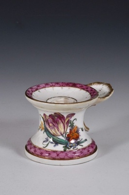 Über einem runden Fuß, der mit 2 Rillen geziert ist, erhebt sich ein zweiteiliger Schaft, der sich zunächst konisch verbreitert. Unter dem Kerzenhalter ist eine tiefe Einziehung geschnitzt. Der Kerzenhalter selbst hat eine zylindrischer Form, mit kleinem Teller am Rande.