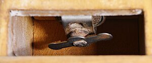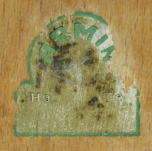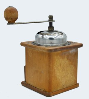 Die Mühle mit Kegelmahlwerk wurde aus lackiertem Buchen- und Eichenholz gefertigt. Auf der Frontseite der Mühle befindet sich ein Aufkleber auf dem noch die oberste, in grüner Farbe gehaltene Schrift "ARMIN" lesbar ist. Weiter unten finden sich die Buchstaben Ha und Ta in weißer Schrift auf grünem Hintergrund. Dies könnte auf eine Kaffeemühle der Firma Armin Trösser hindeuten. Die Kaffeebohnen und/oder der Kaffeeersatz werden bei dieser Mühle oben in die Kuppel eingefüllt und fallen in einen Blechtrichter. Die Kuppel ist leicht beschädigt. Der Schiebemechanismus klemmt und die Öffnung ist ein klein wenig geöffnet. Die Mühle besitzt ein unterstelliges (d.h. der Mahlgrad wird wird von unten geregelt) Kegelmahlwerk. Unter dem Mahlwerk befindet sich eine hölzerne Schublade mit einem Holzgriff in die das Kaffeepulver nach dem Mahlvorgang fällt. Bedient wird das händisch angetriebe Mahlwerk mit einer Kurbel, die sich oberhalb der Kuppel befindet. Die Kurbel besitzt einenflachen flachen Stiel und einen kugelförmigen Holzgriff.