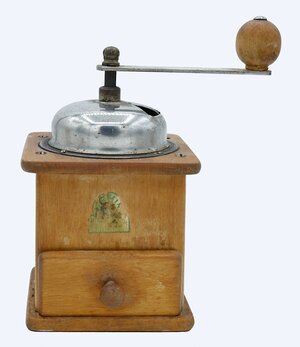 Die Mühle mit Kegelmahlwerk wurde aus lackiertem Buchen- und Eichenholz gefertigt. Auf der Frontseite der Mühle befindet sich ein Aufkleber auf dem noch die oberste, in grüner Farbe gehaltene Schrift "ARMIN" lesbar ist. Weiter unten finden sich die Buchstaben Ha und Ta in weißer Schrift auf grünem Hintergrund. Dies könnte auf eine Kaffeemühle der Firma Armin Trösser hindeuten. Die Kaffeebohnen und/oder der Kaffeeersatz werden bei dieser Mühle oben in die Kuppel eingefüllt und fallen in einen Blechtrichter. Die Kuppel ist leicht beschädigt. Der Schiebemechanismus klemmt und die Öffnung ist ein klein wenig geöffnet. Die Mühle besitzt ein unterstelliges (d.h. der Mahlgrad wird wird von unten geregelt) Kegelmahlwerk. Unter dem Mahlwerk befindet sich eine hölzerne Schublade mit einem Holzgriff in die das Kaffeepulver nach dem Mahlvorgang fällt. Bedient wird das händisch angetriebe Mahlwerk mit einer Kurbel, die sich oberhalb der Kuppel befindet. Die Kurbel besitzt einenflachen flachen Stiel und einen kugelförmigen Holzgriff.