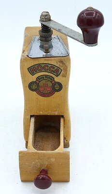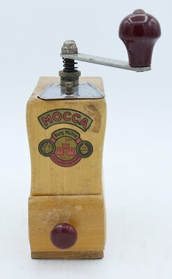 Die Kegelmühle mit feinem Mahlgrad für Mocca wurde aus lackiertem Buchenholz als gefalzter Holzkörper gefertigt. Die Kaffeebohnen und ggf. auch der Kaffeeersatz werden bei dieser Mühle oben in eine vernickelte Deckeklappe eingefüllt und fallen dabei in einen Trichter. Die Mühle besitzt ein obererstelliges (d.h. der Mahlgrad wird wird zwischen Kurbel und Mühlenkörper geregelt) Kegelmahlwerk. Unter dem Mahlwerk befindet sich eine hölzerne Schublade mit einem schwarzen Holzgriff in die das fein gemahlene Kaffeepulver nach dem Mahlvorgang fällt. Das Mahlwerk wird mit einer vernickelten Kurbel, die sich auf diesem und oberhalb der Kuppel befindet, händisch angetrieben. Die Kurbel besitzt einen flachen Stiel und einen dunkelroten Holzgriff. Auf der Frontseite der Mühle befindet sich ein Aufkleber mit der Aufschrift MOCCA, darunter eine weiterer Aufkleber mit dem Markennamen und der Abbildung des Firmenlogos, dem Firmenstandort und zwei Abbildungen einer Medallie, die für gute Qualität verliehen wurde: Burg Mühle Gute Qualität BKF Fredeburg/Sauerland Firmengeschichte: Dieter Ruddies gründete als Heimatvertriebener 1946 seine Firma zur Produktion verschiedener Haushaltsartikel, u.a. auch Kaffeemühlen in Bad Fredeburg. 1962 wurde die Firma auf die Produktion von Bamöbeln umgestellt und ist heute (2023) unter dem Namen Burgbad noch Produzent von diesen.