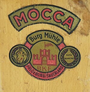 Die Kegelmühle mit feinem Mahlgrad für Mocca wurde aus lackiertem Buchenholz als gefalzter Holzkörper gefertigt. Die Kaffeebohnen und ggf. auch der Kaffeeersatz werden bei dieser Mühle oben in eine vernickelte Deckeklappe eingefüllt und fallen dabei in einen Trichter. Die Mühle besitzt ein obererstelliges (d.h. der Mahlgrad wird wird zwischen Kurbel und Mühlenkörper geregelt) Kegelmahlwerk. Unter dem Mahlwerk befindet sich eine hölzerne Schublade mit einem schwarzen Holzgriff in die das fein gemahlene Kaffeepulver nach dem Mahlvorgang fällt. Das Mahlwerk wird mit einer vernickelten Kurbel, die sich auf diesem und oberhalb der Kuppel befindet, händisch angetrieben. Die Kurbel besitzt einen flachen Stiel und einen dunkelroten Holzgriff. Auf der Frontseite der Mühle befindet sich ein Aufkleber mit der Aufschrift MOCCA, darunter eine weiterer Aufkleber mit dem Markennamen und der Abbildung des Firmenlogos, dem Firmenstandort und zwei Abbildungen einer Medallie, die für gute Qualität verliehen wurde: Burg Mühle Gute Qualität BKF Fredeburg/Sauerland Firmengeschichte: Dieter Ruddies gründete als Heimatvertriebener 1946 seine Firma zur Produktion verschiedener Haushaltsartikel, u.a. auch Kaffeemühlen in Bad Fredeburg. 1962 wurde die Firma auf die Produktion von Bamöbeln umgestellt und ist heute (2023) unter dem Namen Burgbad noch Produzent von diesen.